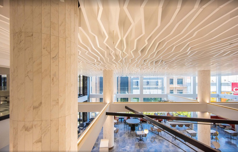 使用现有的建筑结构始终是一项挑战,尤其是在位于极其繁忙的位置,一个核心地带。应对这一系列挑战,设计师最大限度地利用了异地/模块化制造。选择在现有建筑中增加和减少,在一些地方创造空隙,并在其他地方包裹新的织物。这些设计决策加上雕塑的搬迁和新的特色天花板是引人注目的。在保留原有建筑主体和风貌的同时,又为这个标志性建筑注入了新的活力。