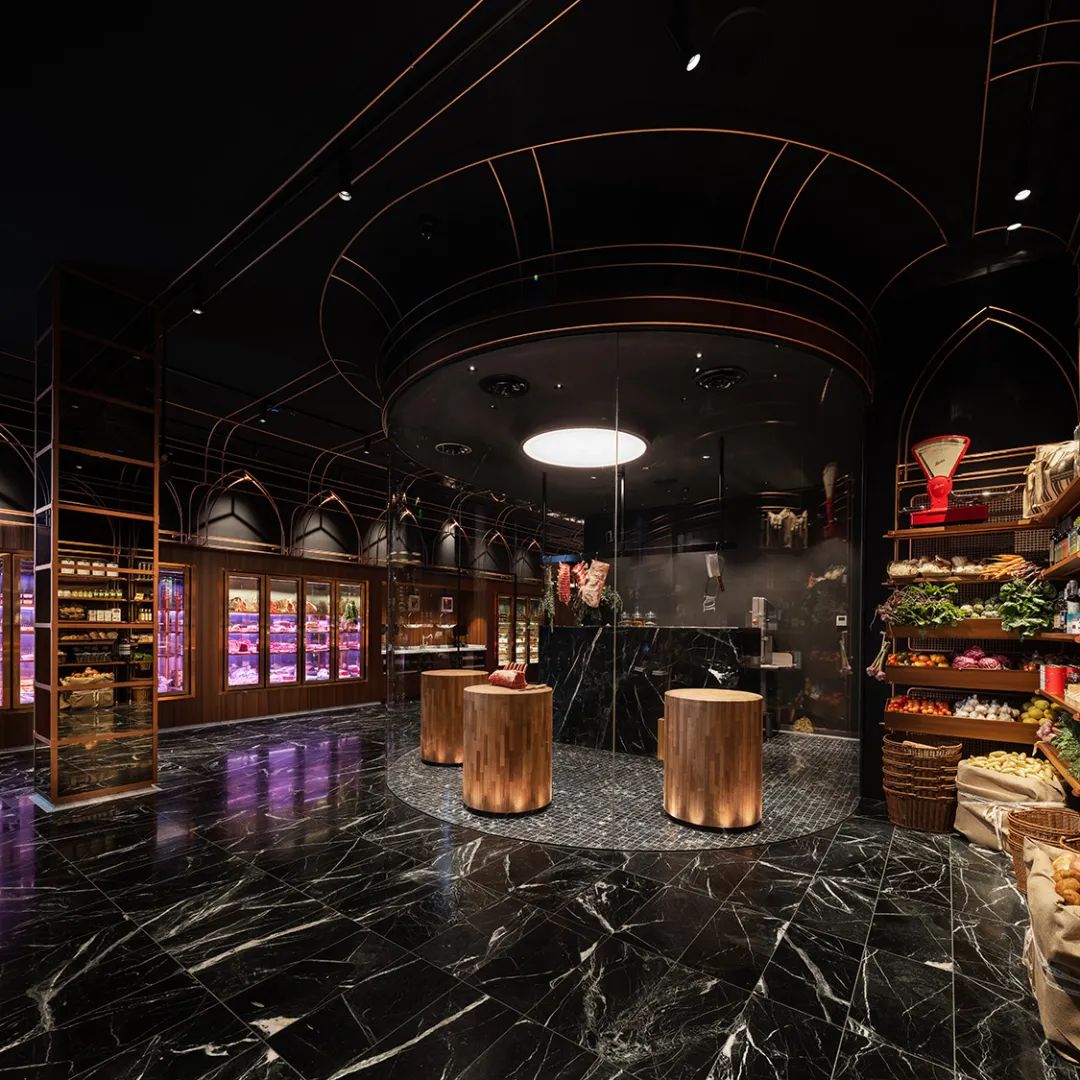 设计师罗德·福丘将悉尼店的店主理念、传统和体验转化为独特的体验。它具有第一家店铺的许多标志性特征,包括养护室中的喜马拉雅盐砖,位于中央的实木屠宰砖和大理石地板,这两家商店都有引人注目的灯光、深色和曲线造型。