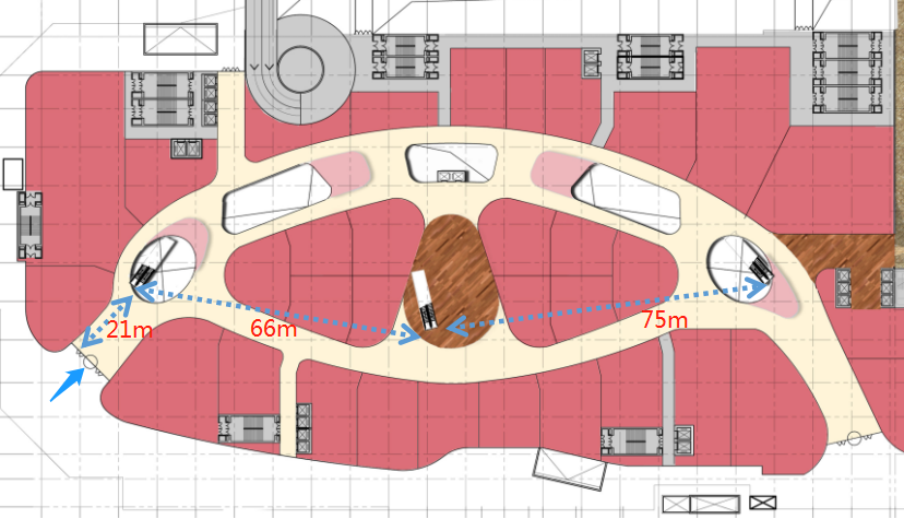 步行水平动线适宜的长度(总长度以200m~400m为宜,主动线一般不超300m)人水平视角 30°是其舒适范围内看的最远的视角;节点之间的长应小于等于其宽度的三倍为宜(可达性)。