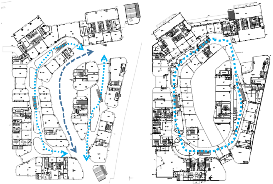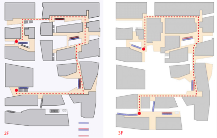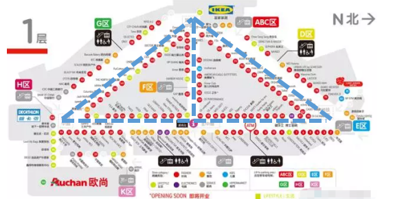 日字形水平动线:动线成环形成人流回路,同时有利于布置更多的商铺。