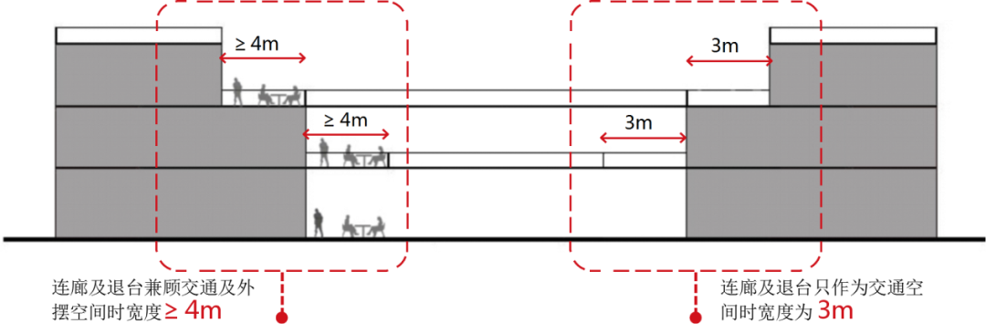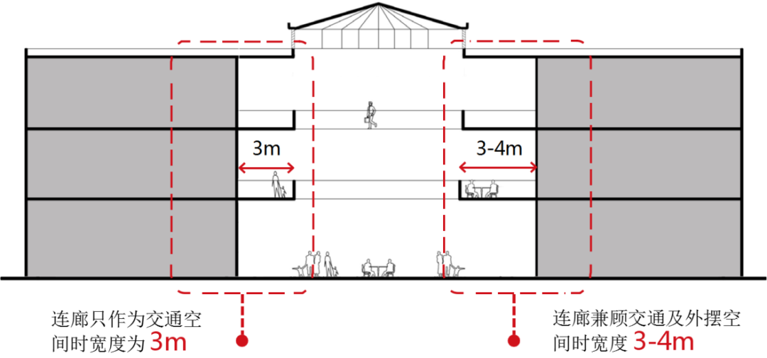 室外商业街需设置退台及连廊时,应注意: