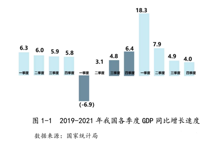 2021年,我国国内生产总值为1143670亿元,较上年增长8.1%,占全球 GDP的比重继续提高,人均国内生产总值突破1.2万美元,接近世界银行的高收入国家门槛,经济增长国际领先;经济总量达114.4万亿元,突破110万亿元,稳居世界第二,实现“十四五”良好开局。与此同时,经济发展活力持续恢复。从季度增长同比增长速度看,2021年一、二、三、四季度 GDP 同比分别增长18.3%、7.9%、4.9%、4.0%,各季度均保持在5%以上的增速,国民经济整体运行在合理区间,产业发展活力持续恢复。