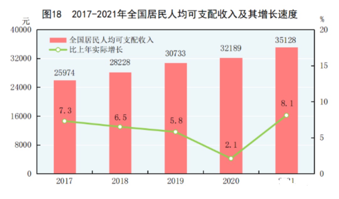 根据国家统计局发布的《2021年国民经济和社会发展统计公报》显示,2021年,全年全国居民人均可支配收入35128元,比上年增长9.1%,扣除价格因素,实际增长8.1%。快于人均GDP增速,与GDP增速同步。全国居民人均可支配收入中位数29975元,增长8.8%。