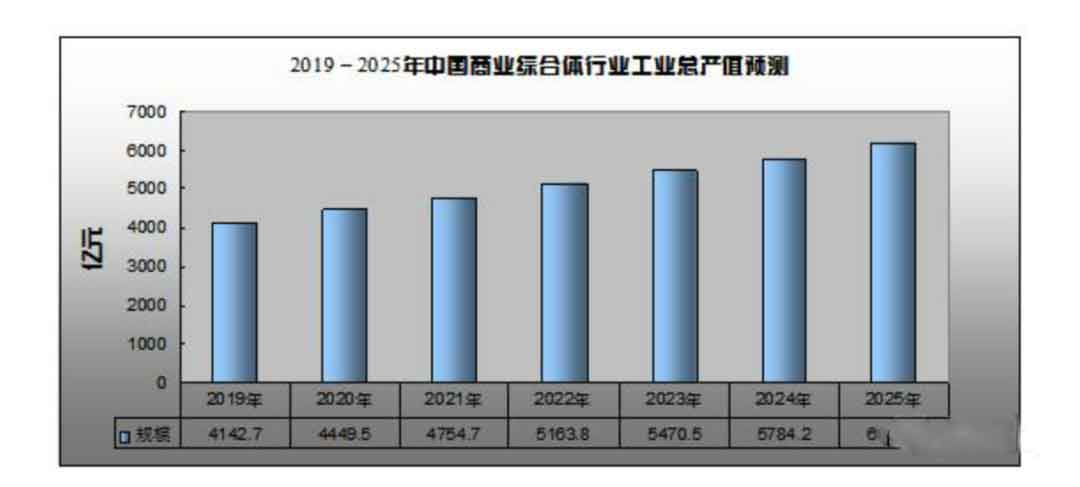 根据统计数据预测2019-2025年我国文旅商业综合体产业工业总产值逐年上升,预计2025年我国商业综合体产业工业总产值达6198.6亿元。