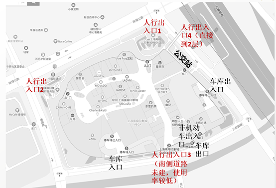 以南翔印象城为例,1层人行出入口有三个,1号是主入口,服务于东侧留云湖周边客群,南面南翔老镇区居民;2号是次入口,承接嘉闵高架来向的嘉定新城区,江桥镇区客群。
