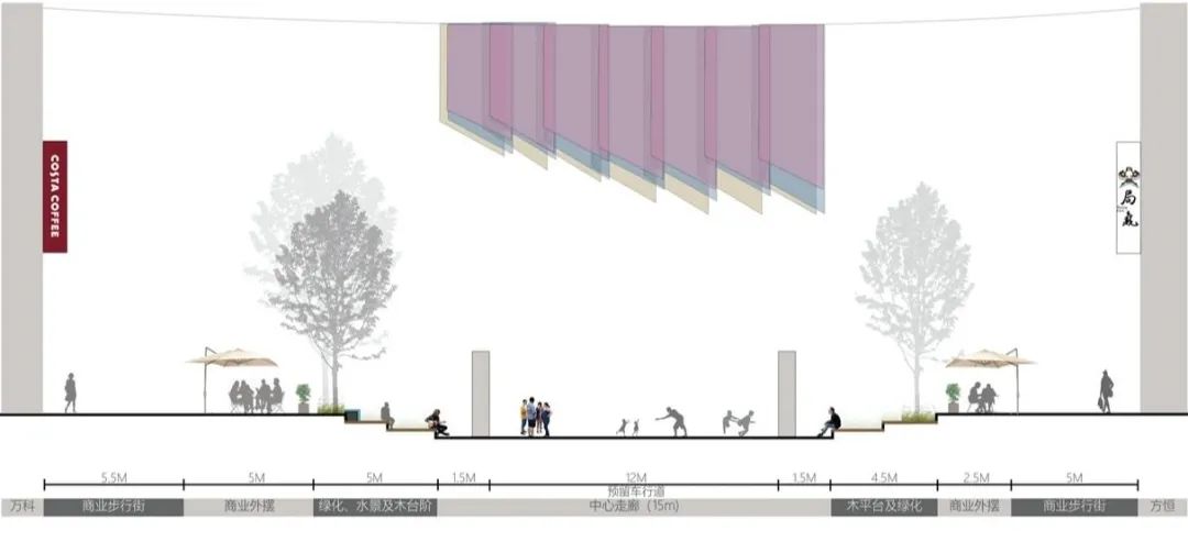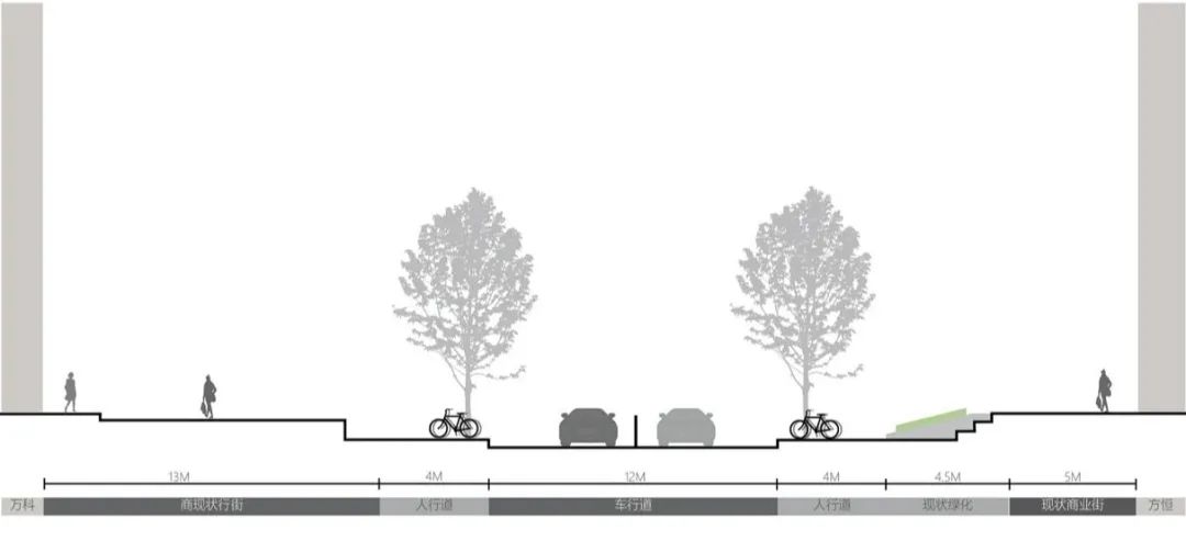 策略1:步行街保持原12米车道路宽度不变,预留应急通车需求,同时可为休闲活动及商业活动留白。