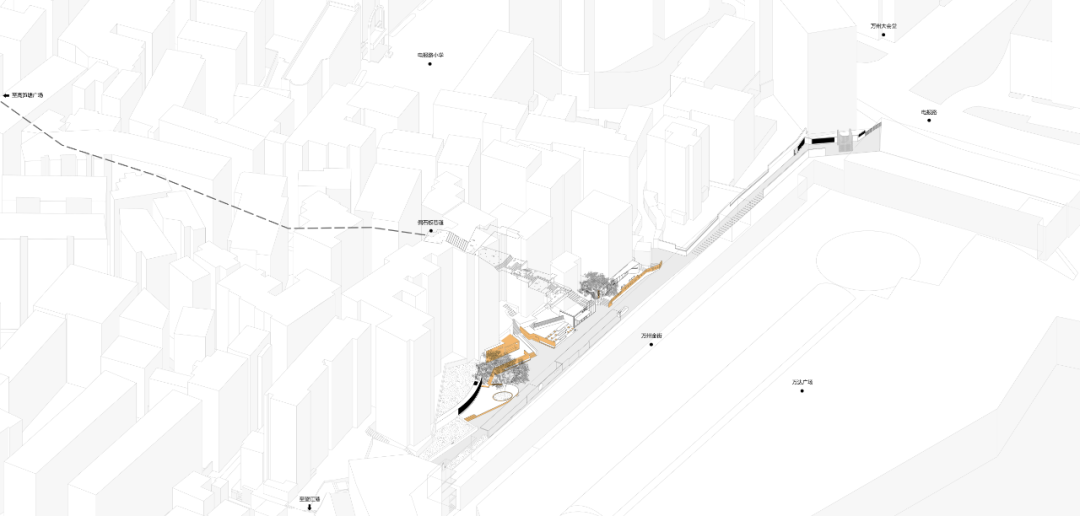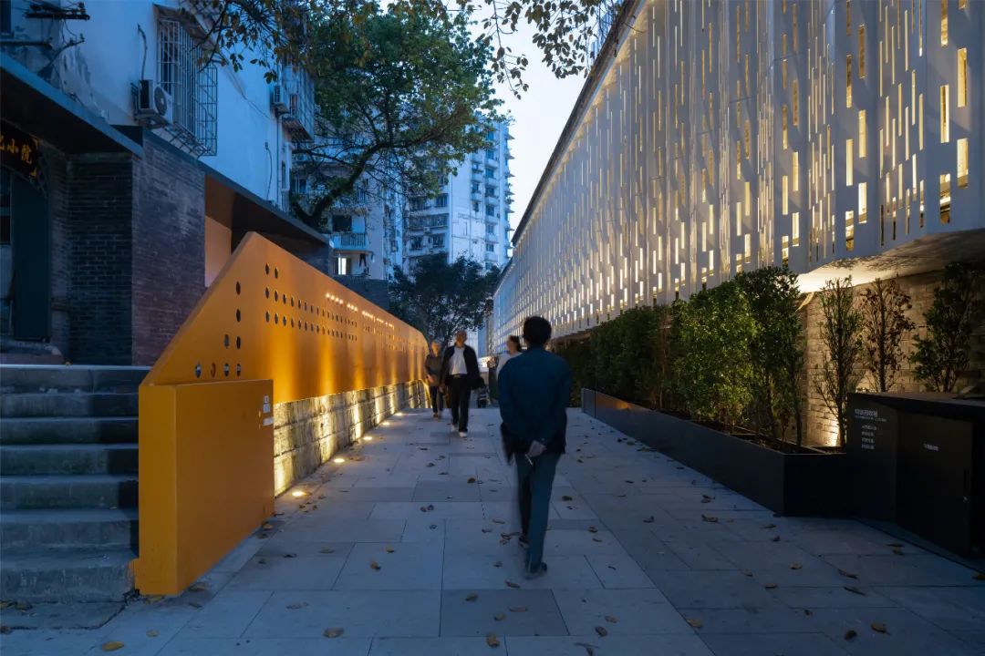 相较传统的城市街道空间,40米宽的小街更像是一个城市公共走廊,通过模糊边界,利用现有高差区分通行空间和停留空间,建筑立面到整体多维的一体化等手段,打造一个既细腻又极具体验的纯步行公共空间。