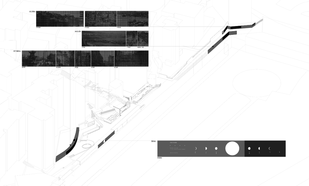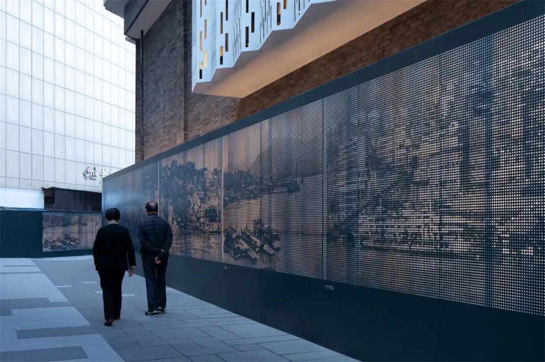 以多重文化记忆的载体、参数化的形式与镂空钢板景墙的设计,当人们远看的时候利用反射可以看到过去老城的风貌,以前的万州港、西山钟楼的繁荣景象,增加了文化底蕴,唤起人们对万州过去的记忆。
