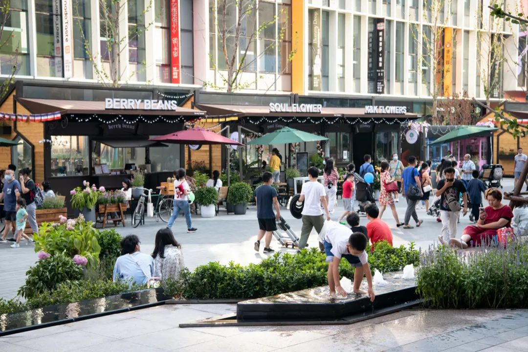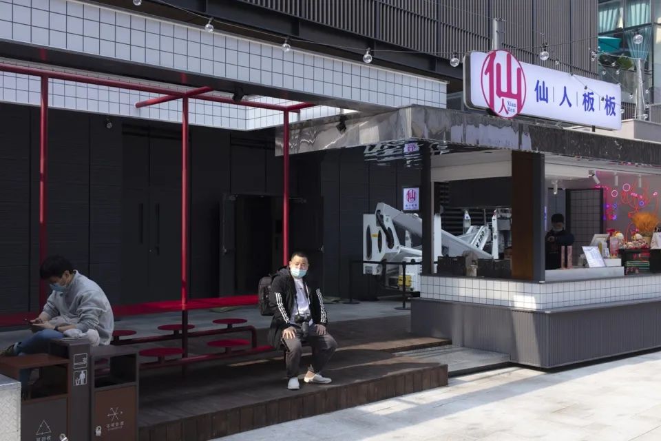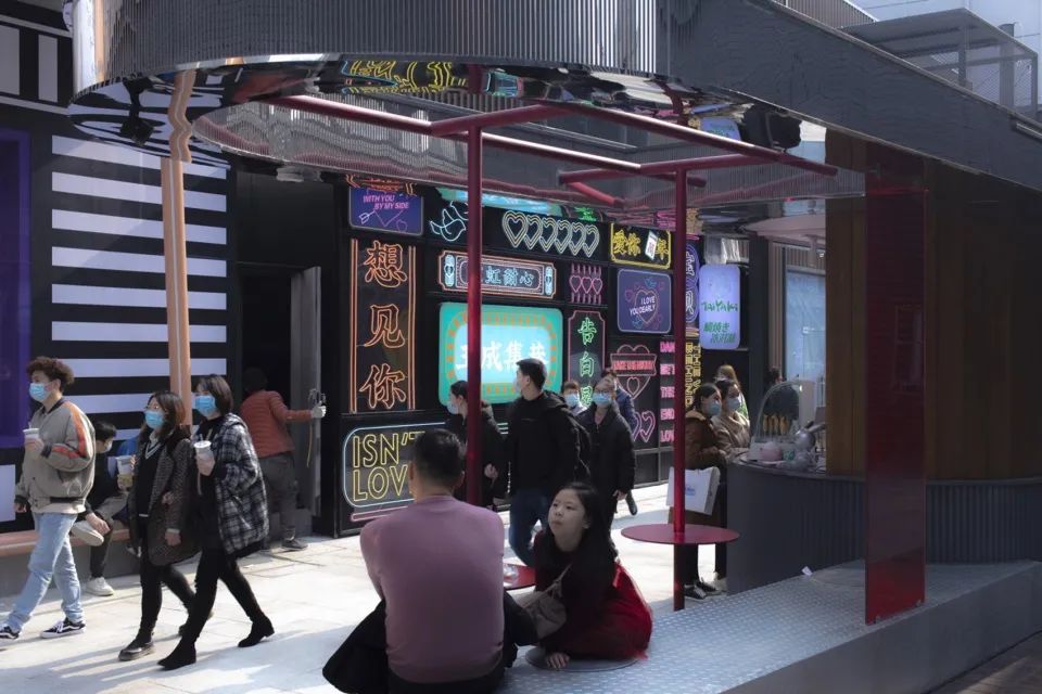 根据城市建筑肌理、道路格局,在各景观节点附近布置如DJ台、快闪店、鲜花店等情景业态,局部放大的空间得以借景借势,融入到长街之中。