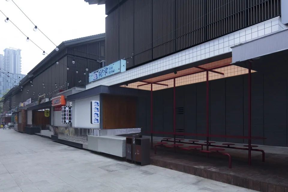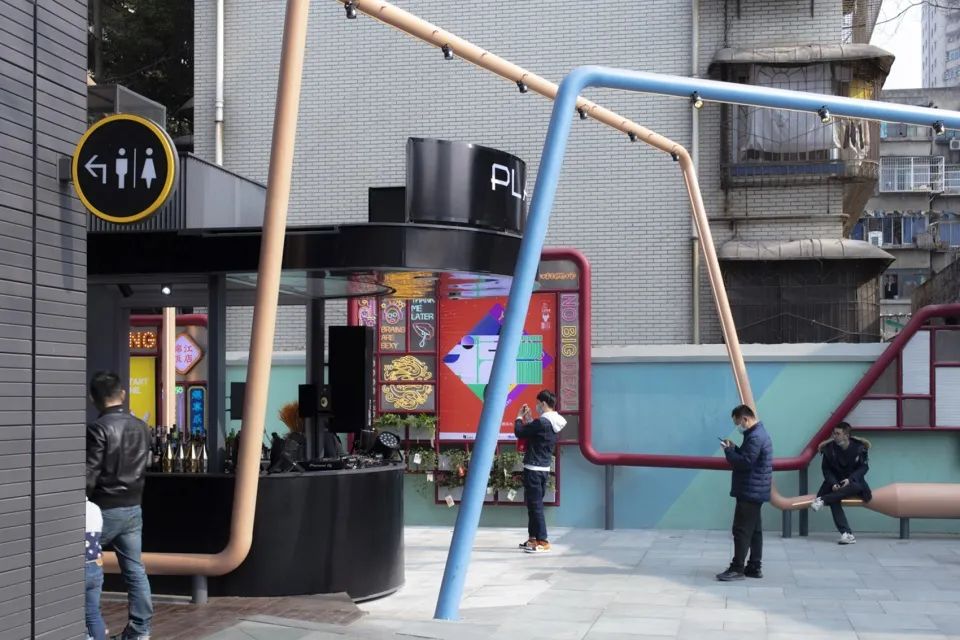 以及为解决街面空荡乏味的问题,采用直径为15厘米的钢管进行环境设计。律动的管体构成了玉成街的入口门廊、景观墙面、临时座位。管体上部预留埋件悬挂灯具,可以根据不同的场景需要,悬挂不同的饰物或装置。
