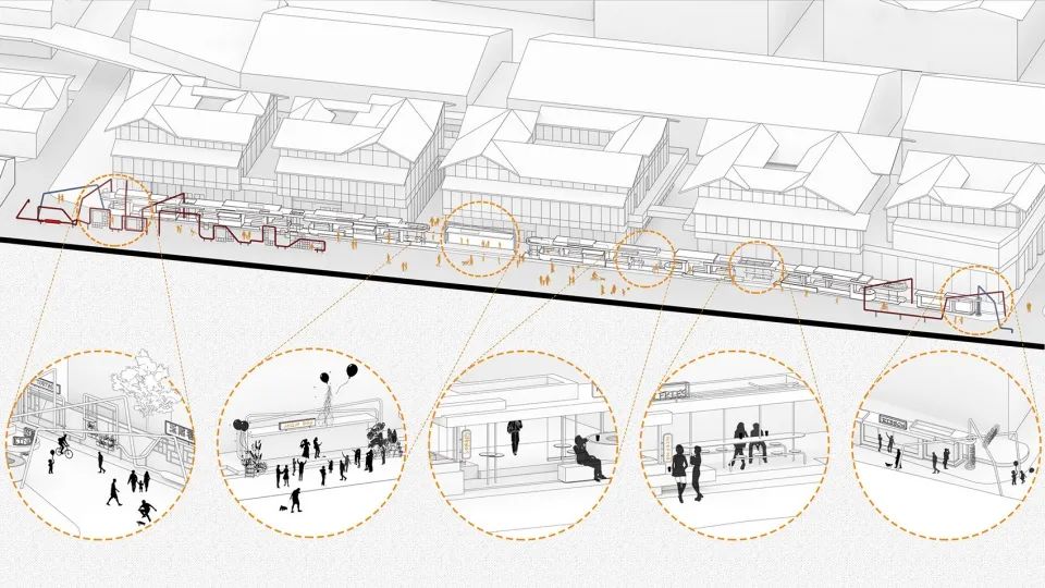 连续性以保证新旧环境之间有足够长的接触面,可以承载即将引入的经营内容,提供足够丰富的消费场景;参与性以保证连续的界面不会显得单调乏味,利用分段的放大空间或口袋景观设计,使更多的路人可以休憩停留。
