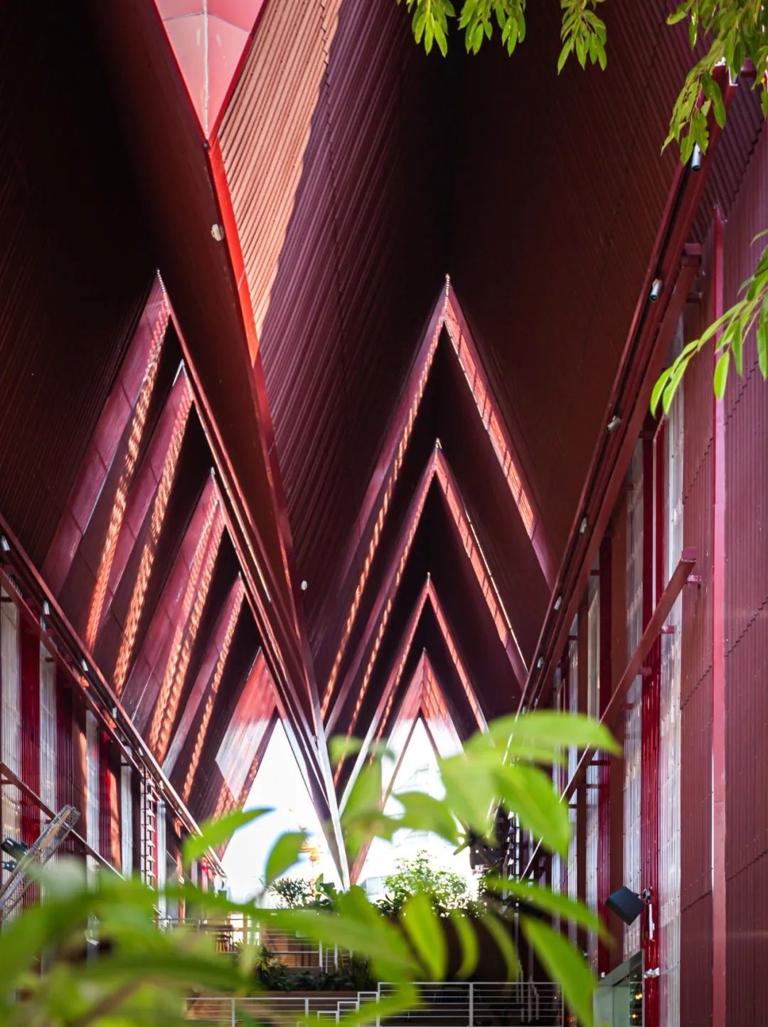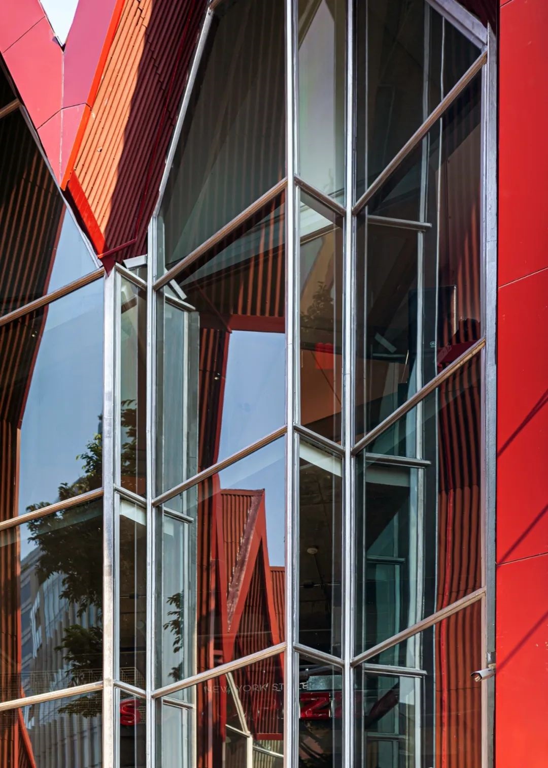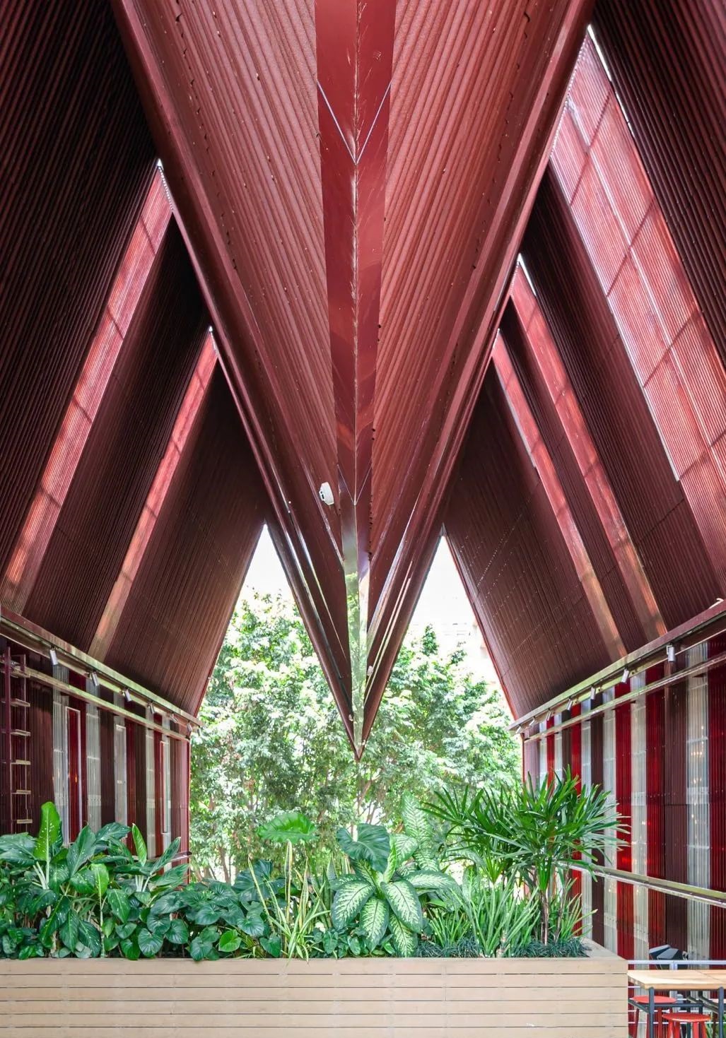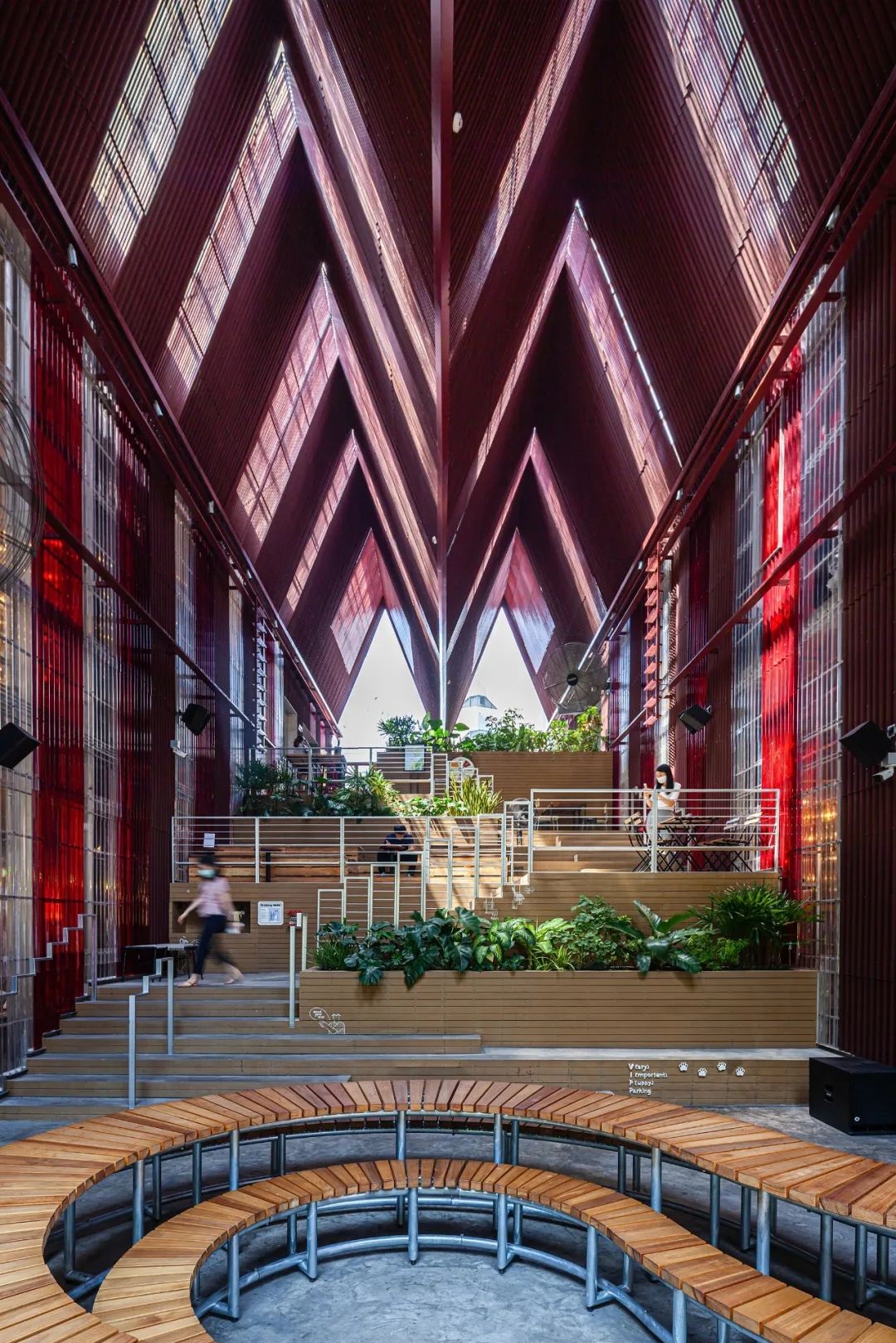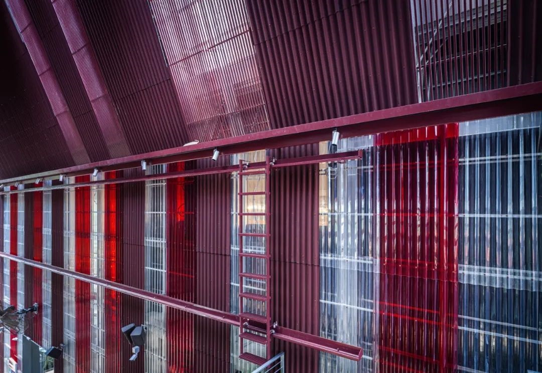 红色瓦楞板作为主要的建筑材料围合出开敞的空间,暗红的颜色和起伏的表面均是对历史的回敬,而不同透明度的材质交叠又丰富了视觉感受。