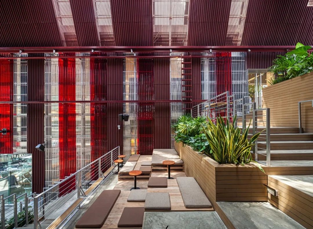 建筑采用层层递进的大台阶与平台交错结合,并在其中穿插有座椅和植物。如此贴自然和亲人的尺度削弱了高耸空间带来的不适感。