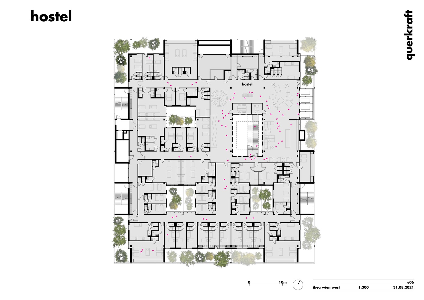 通过开放的平面图混合各种功能。预制的钢筋混凝土柱矗立在约10×10米的网格上,使空间的使用和设计具有灵活性。可以很容易地进行调整以满足不断变化的需求,这一点已经变得很明显。宜家的零售店占据了较低的楼层,而拥有345个床位的Jo&Joe旅馆则位于最上面的两层。这种组合创造了一个每周7天、每天24小时都有活力的建筑。