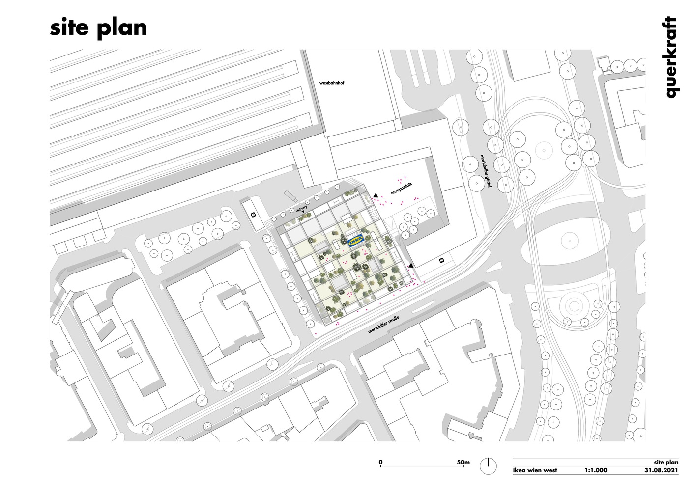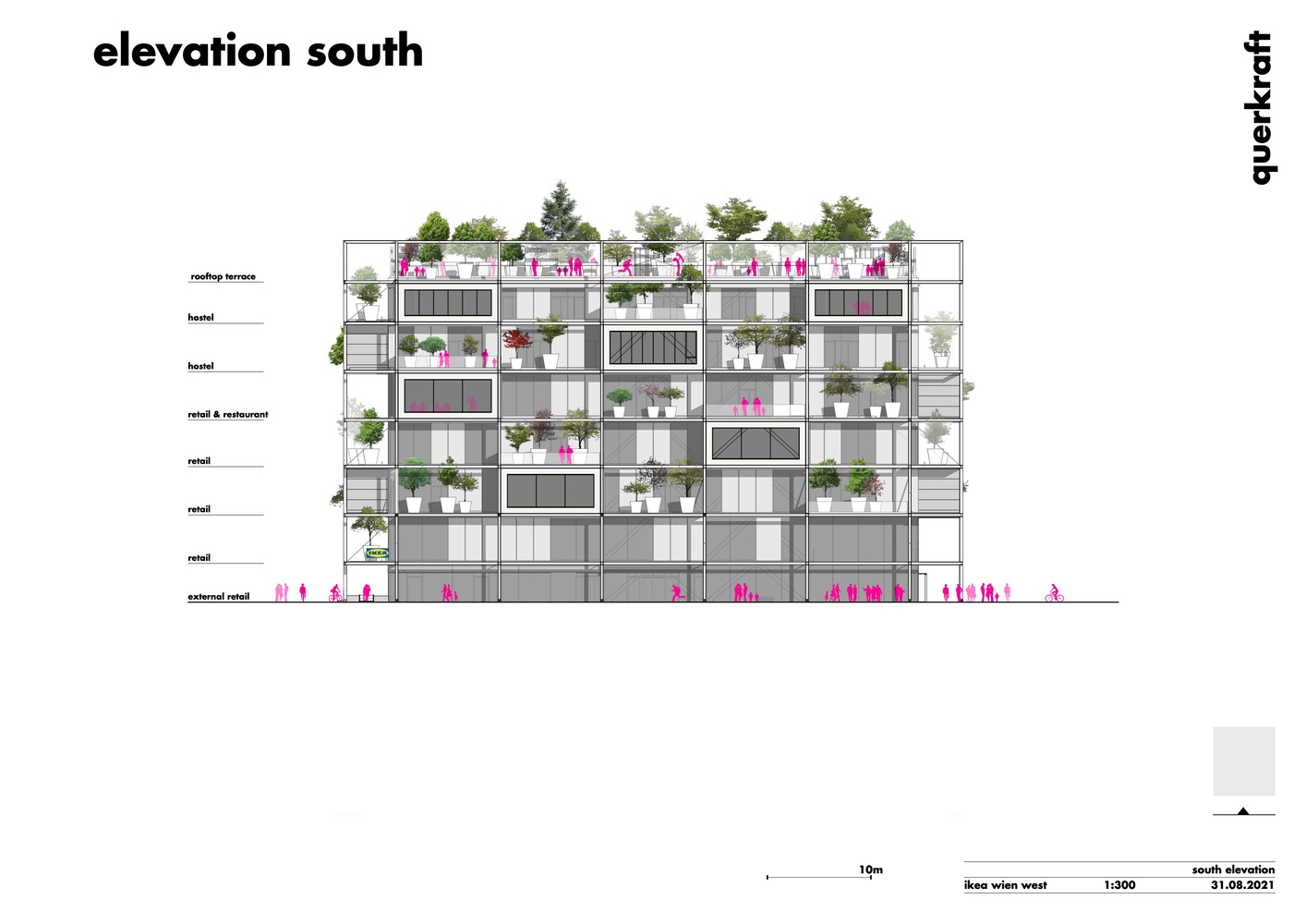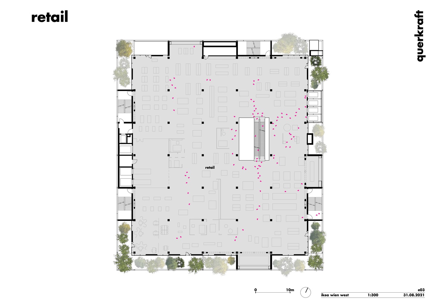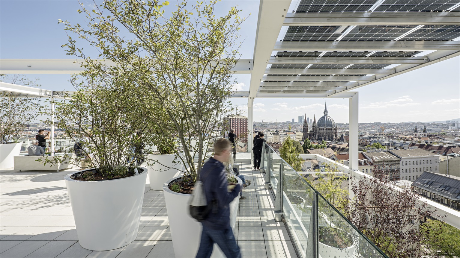 建筑物上和周围有60棵树。外墙和屋顶上的树木对小气候有可感知的影响。由于树木可以被放置在建筑的不同高度和深度,所以比起在建筑的地面上可能种植的更多。在维也纳市的 “城市热岛战略计划 “中,种植是最重要的措施之一。宜家家具店的攀援植物和树木具有冷却和加湿的效果–就像一种天然的空调系统。人行道上的空气温度也将得到改善。计算机模拟显示,相关的温度会下降1.5℃。