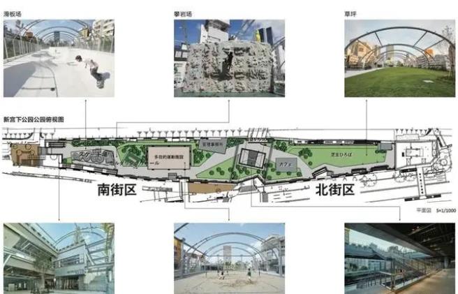 整个宫下公园项目全长 330 米,分为南北两个街区,是一座包括三层商业设施、楼顶公园,且容纳停车场与酒店建筑的具有独创设计与商业功能的立体都市公园,为熙来攘往的涩谷区添了一处可供歇息的绿色空间。