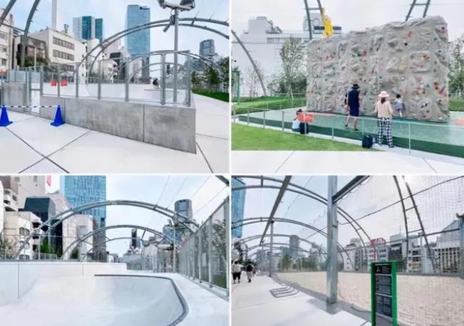 “公园X社区“依旧是该设施的重点,屋顶公园是一处充满现代感的广阔绿色空间,园内分为2个区域。其中一区设有滑板区、抱石攀岩墙、多功能运动设施等,另一区则有咖啡厅及草坪广场,因为设置了足够多的座椅,也在一定程度上起到了公共空间的作用。