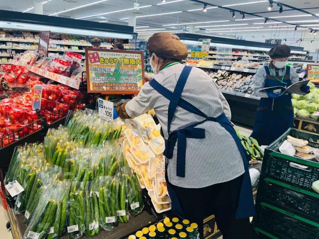 在inageya门店,工作人员向我们解释了蔬果应季商品的陈列技巧。新鲜果蔬从开始上市到盛果期都有着一套严格的陈列位置和陈列量的标准。同时,根据周围商圈消费者的生活习惯,对于大葱切丝装的粗细和分量也有着严格的考量。