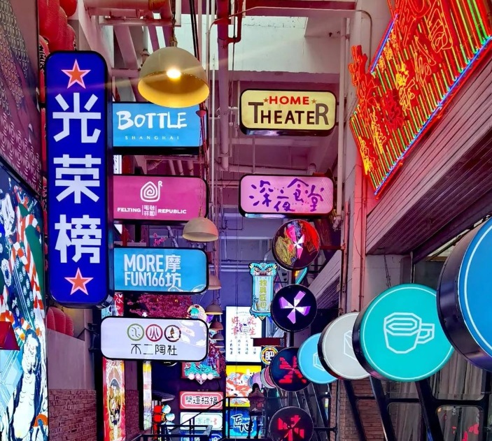 上海静安大悦城,一个魔都最懂年轻人的场子,它是上海首家屋顶轻艺术主题街区,它通过后工业时代风格,以手作人街、霓虹街、未央街三个主题版块街道为重点布局。