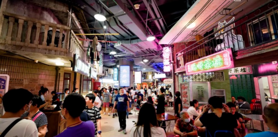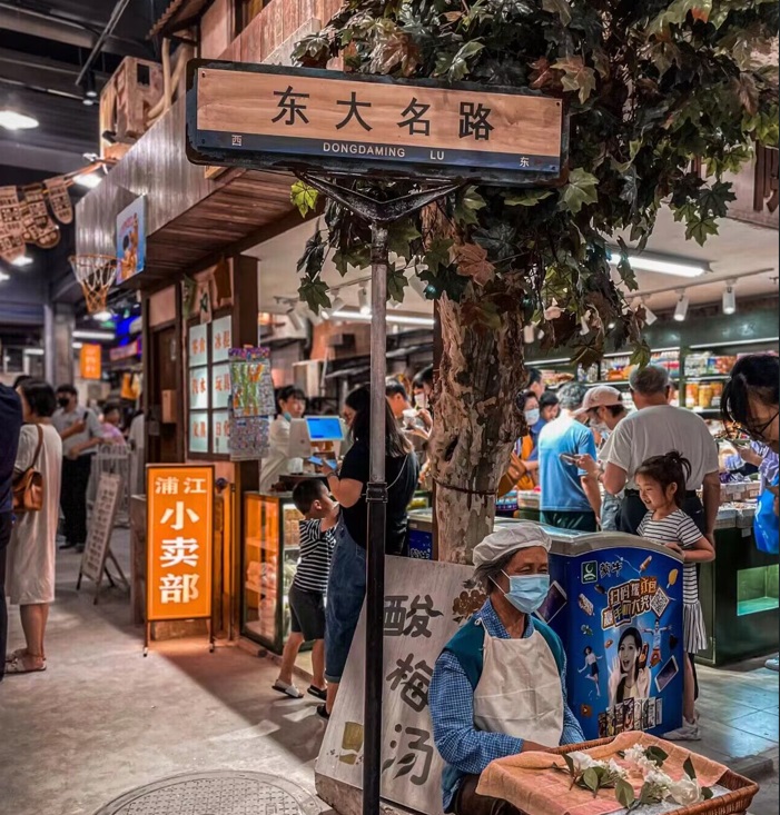 在北外滩来福士,里弄城市集市街区内逼真地还原了上世纪90年代的老上海弄堂场景,回归市井烟火气息,将多处具有历史文化遗产价值的老建筑直接“搬”到了街区内,在蜿蜒分布的“弄堂”场景中。