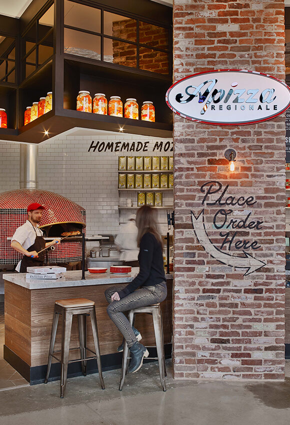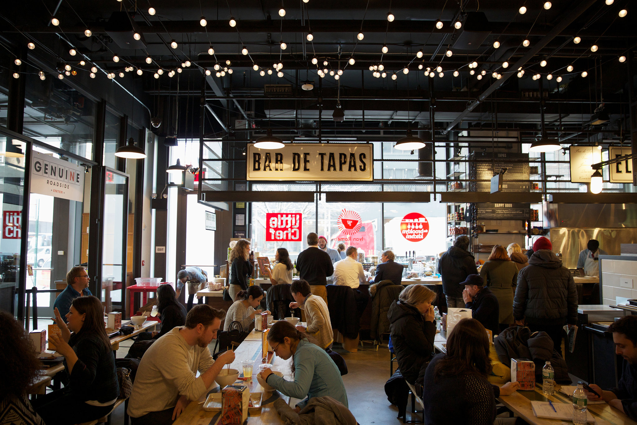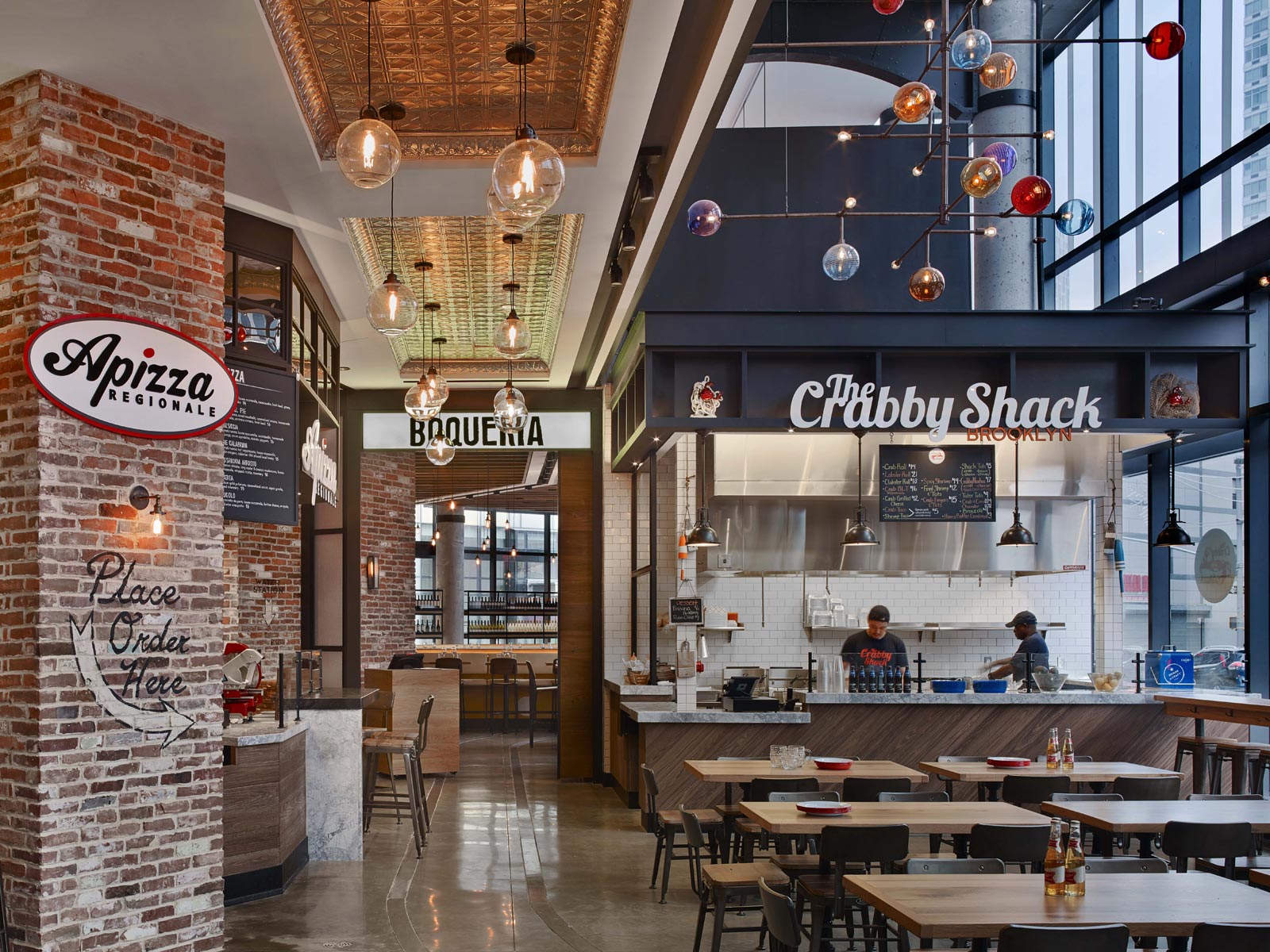 在布鲁克林格林堡的阿什兰住宅楼下,一个新的八个餐厅中心——哥谭市场——刚刚开业。里面有落地窗、裸露的砖块、再生木材,当然还有众多的食物和饮料可供选择。通过热情、现代主义的方法,成功地统一了多样化的产品。作为中心装饰,180 个彩色手工吹制玻璃灯泡组成了一个与众不同的枝形吊灯。在这里,创造了一个既优雅又有趣的空间。
