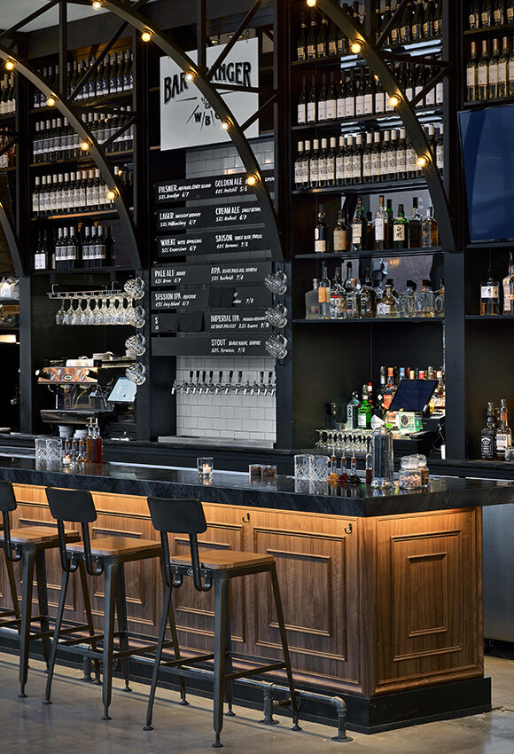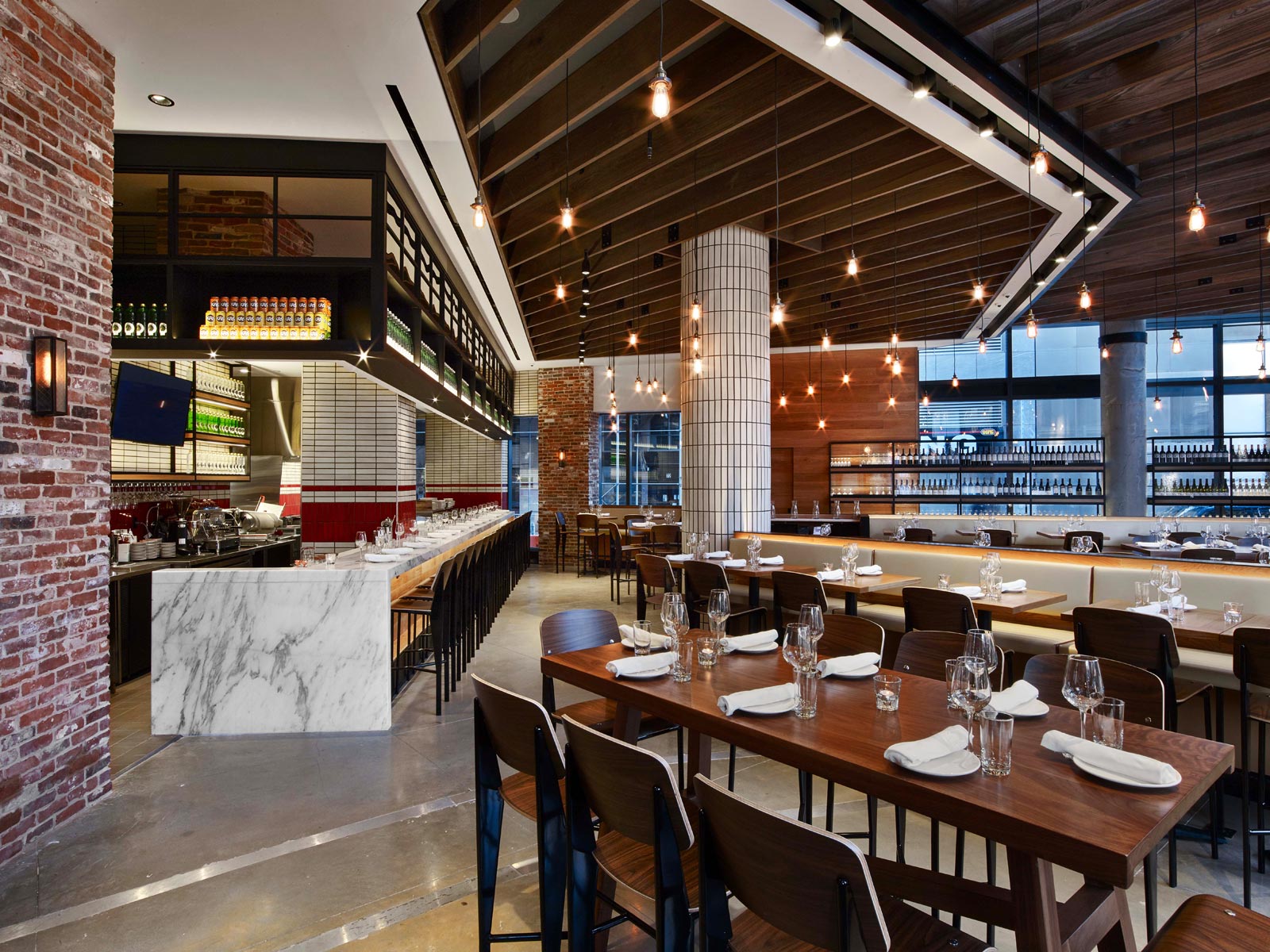 这是一座新建筑,所以这首先是在纸上完成的,这个空间的足迹感到非常兴奋。这是一个完全开放的店面。啤酒唤起了该地区的工业历史,但又具有现代的优雅。 不得不想象这一切意味着,对市场的渴望,但最终变成了多个不同的拼贴或配置餐厅的概念。它们都紧密地存在于布鲁克林仓库环境中,天花板高达 25 至 28 英尺。