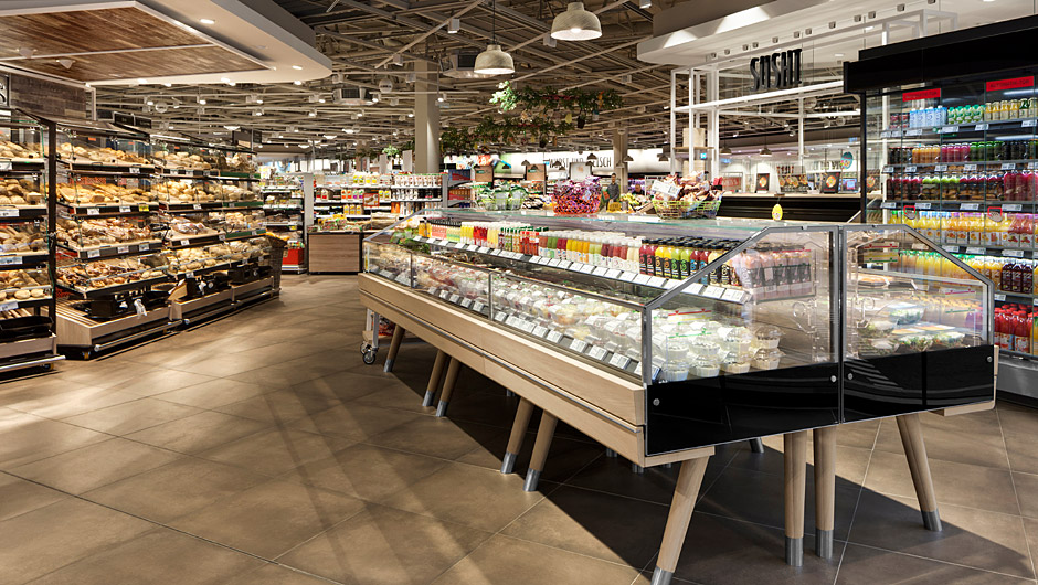 新鲜度的中心主题贯穿整个客户旅程。熟食柜台后面是烘焙站和许多冷藏便利设施,包括寿司和大型沙拉吧。中间的冷藏柜有抽屉,如果需要,也可用于交又销售活动。