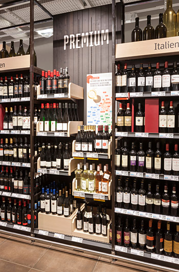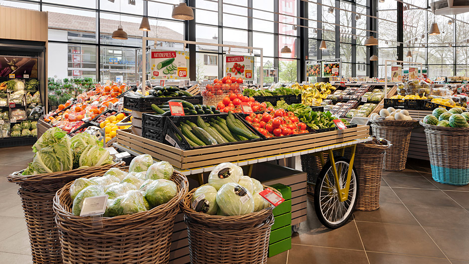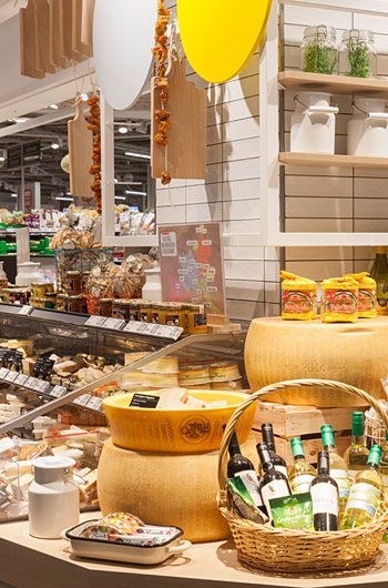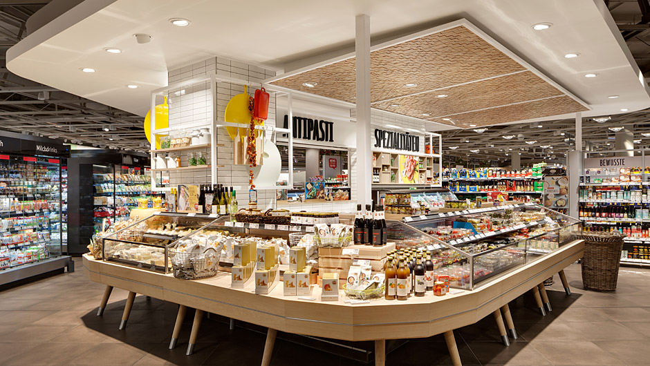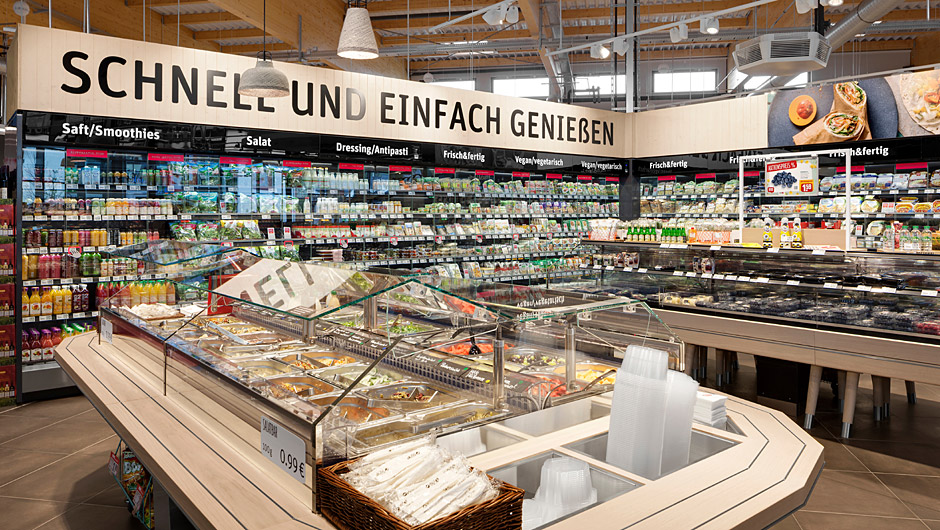 由于靠近瑞士边境,整个市场的产品种类更加丰富。在这里,“即食”和“外带”的主题也进入了入口区,提供各种新鲜便利的商品和一个大型沙拉吧。