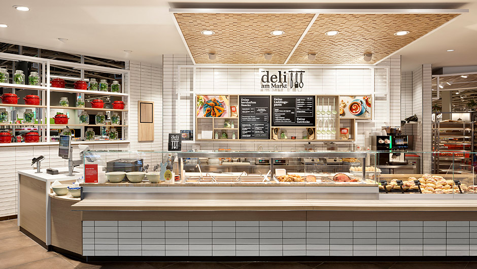 Rewe商店装修改造的市场位于柏有收银台的熟食站之一,Rewe包括汉堡、烤指关节和夹心小吃