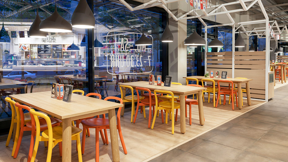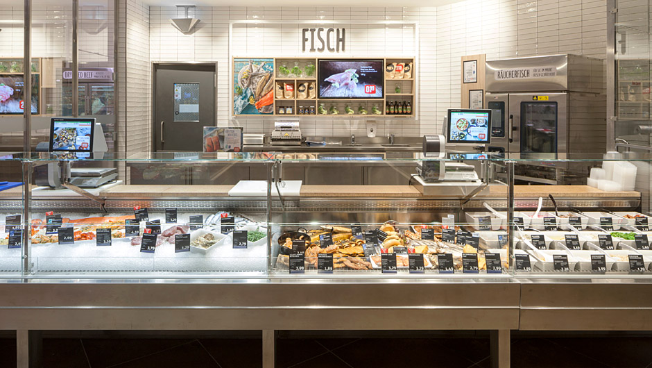 服务柜台也以白色呈现,并带有清晰的黑色产品标签。还注重灵活性:如果需要,鱼柜台提供的家具可以转换成自助服务站。