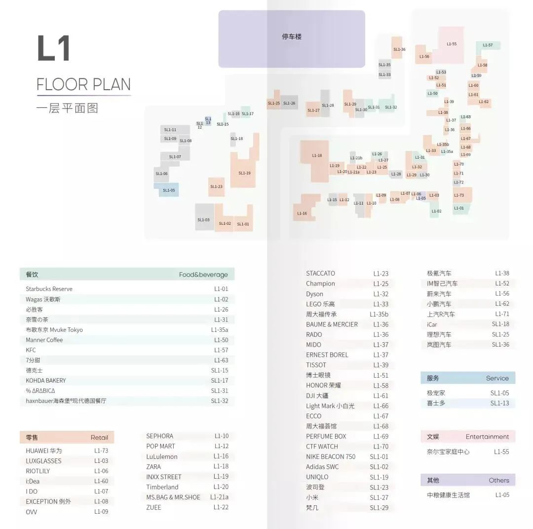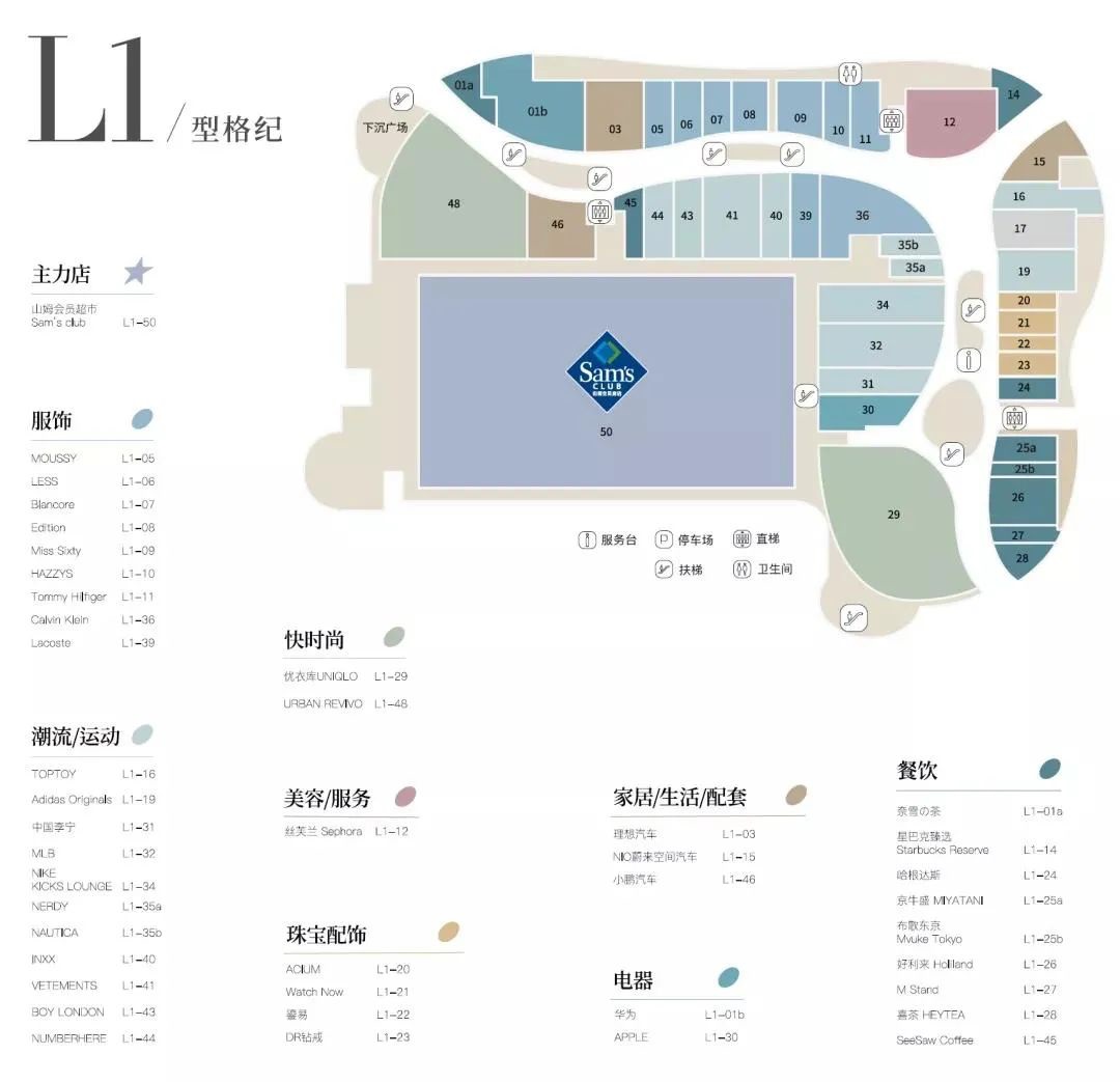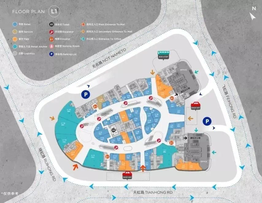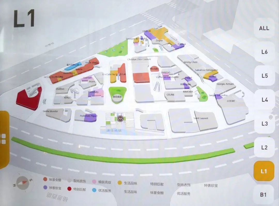 商业建筑面积14万平方米(不包括停车场),停车位于B2-B1。商业经营楼层B1-L6,平面规划为带弧度的单一动线,一层以服饰(下图绿色)、生活方式(下图蓝色)品牌为主。儿童、娱乐业态集中在L4-L5楼。