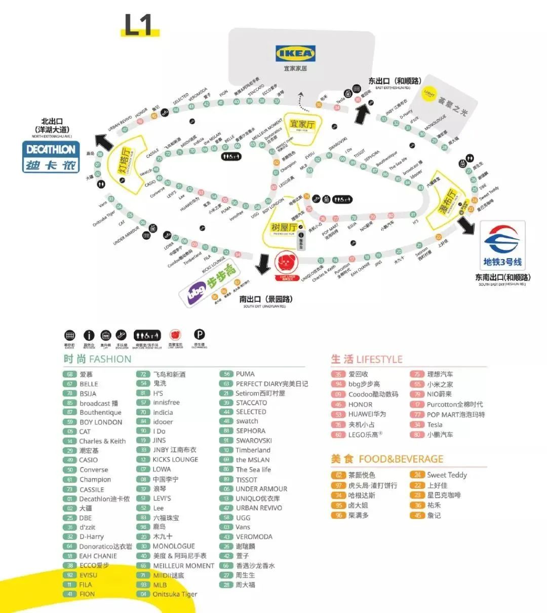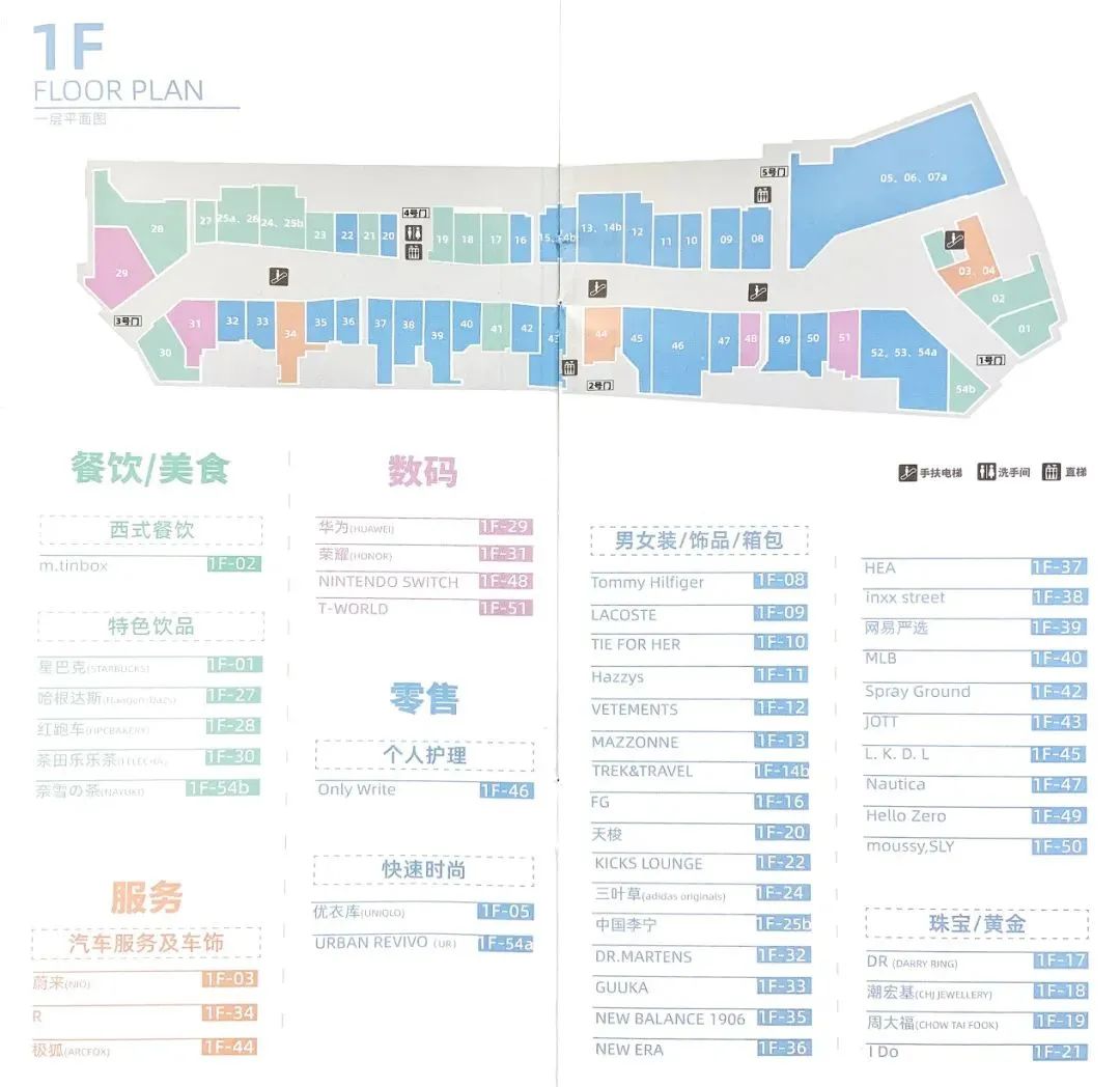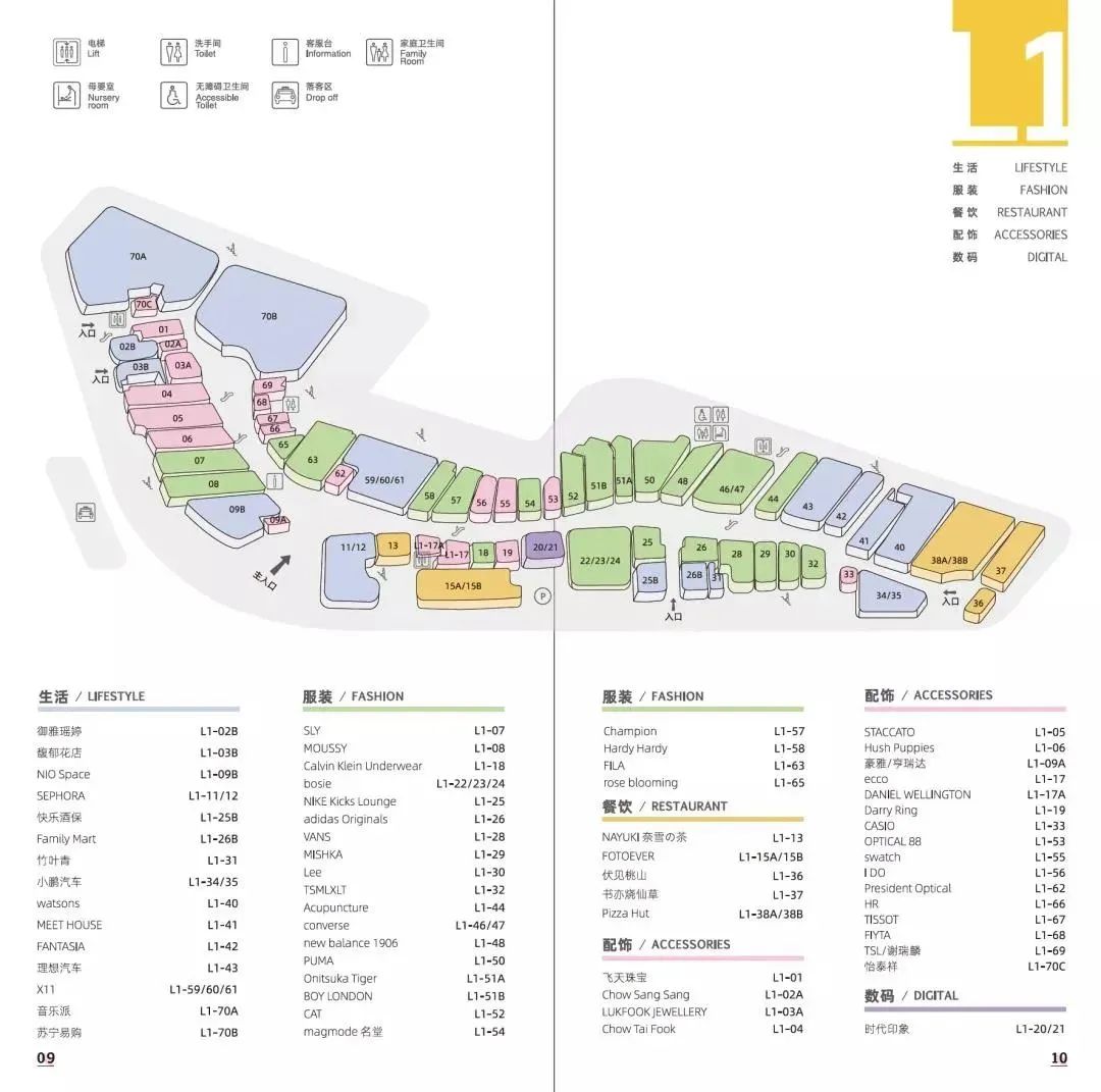 商业建筑面积14万平方米(不包括停车场),停车位于B2-B1。商业经营楼层B1-L6,平面规划为带弧度的单一动线,一层以服饰(下图绿色)、生活方式(下图蓝色)品牌为主。儿童、娱乐业态集中在L4-L5楼。