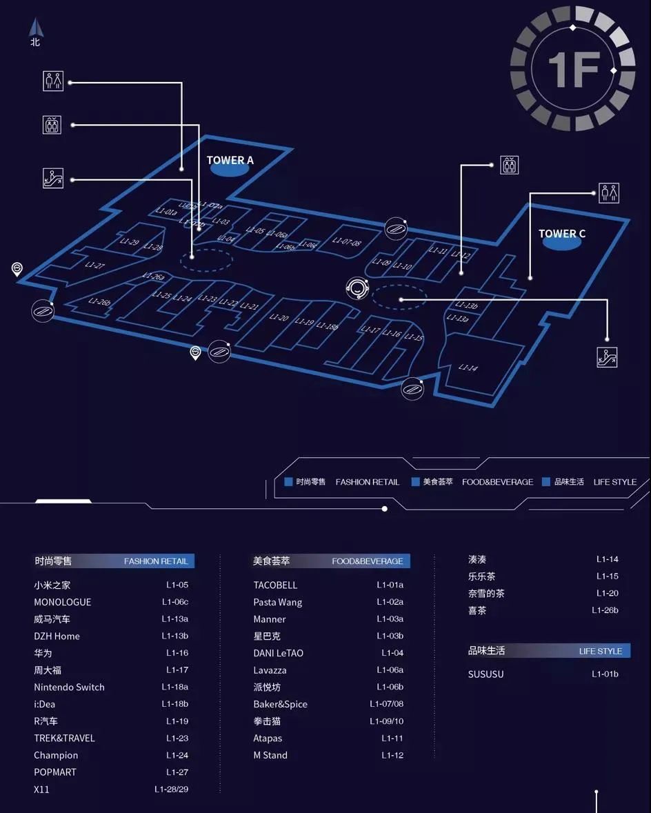 盒子商业又分为北区和南区。北区从LG-L5M共计7层,南区则主要是B2-LG共3层,南区的店铺集中在餐饮业态。