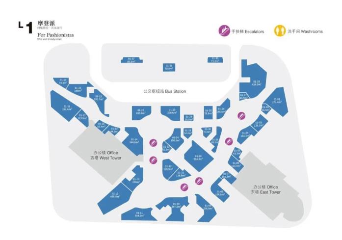从L1层的平面图上可以很清晰看到,整个项目有2个主入口和3个次入口,内部动线呈0字形,逛起来几乎不会走回头路,且店铺的展面与面积对应关系极佳,几乎没有「大肚子」,切铺十分合理。