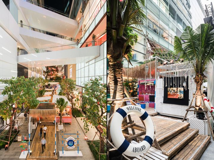 泰国曼谷的 The EM District 购物中心在2016年推出了快闪沙滩主题街区。以世界著名沙滩为灵感的7个沙滩主题被排列在购物中心两个分馆 Emporium 和 Emquartier 之间的狭长小路上,为曼谷的国际化客群提供独特的购物体验。