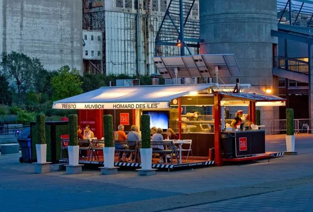 在始于加拿大的 MUVBOX 计划中,利用二手集装箱建成小餐馆,放置在各个开放公共空间中。餐厅40%电力来源于太阳能,另外60%的电力来源于丙烷。目前已经能在纽约、多伦多甚至巴黎看到他们的踪影。