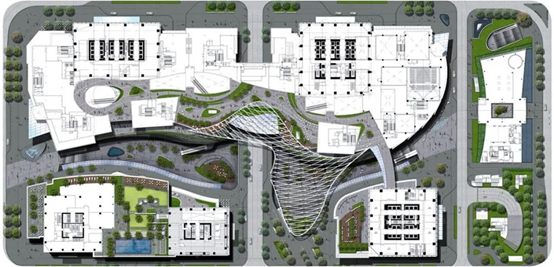 在疫情时代,人们对绿色自然愈发向往,室外商业空间也随之成为社交需求的承载体。项目以“外方·内圆”为建筑设计概念,参照自然山谷在建筑内部形成“峡谷”,顺应发展趋势的同时,也塑造了项目独特的空间肌理。