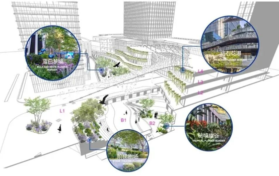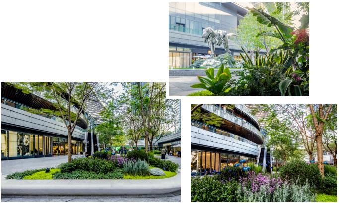 立体的空间里形成了环境的“多样性”,契合不同环境的变化,项目打造了“自然风”与“热带阴生”两种风格花境,实现自然与空间互融共通。
