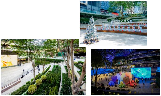 阶梯剧场前的广场可以举办各种丰富的活动,对人流形成集聚效应。前方是下沉广场中央,可以举办不定期的策展互动活动。正对面是数字艺术装置《风语》,随着实时的风感风速,不停地变换移动,形成一幅专属于“你”的艺术作品。